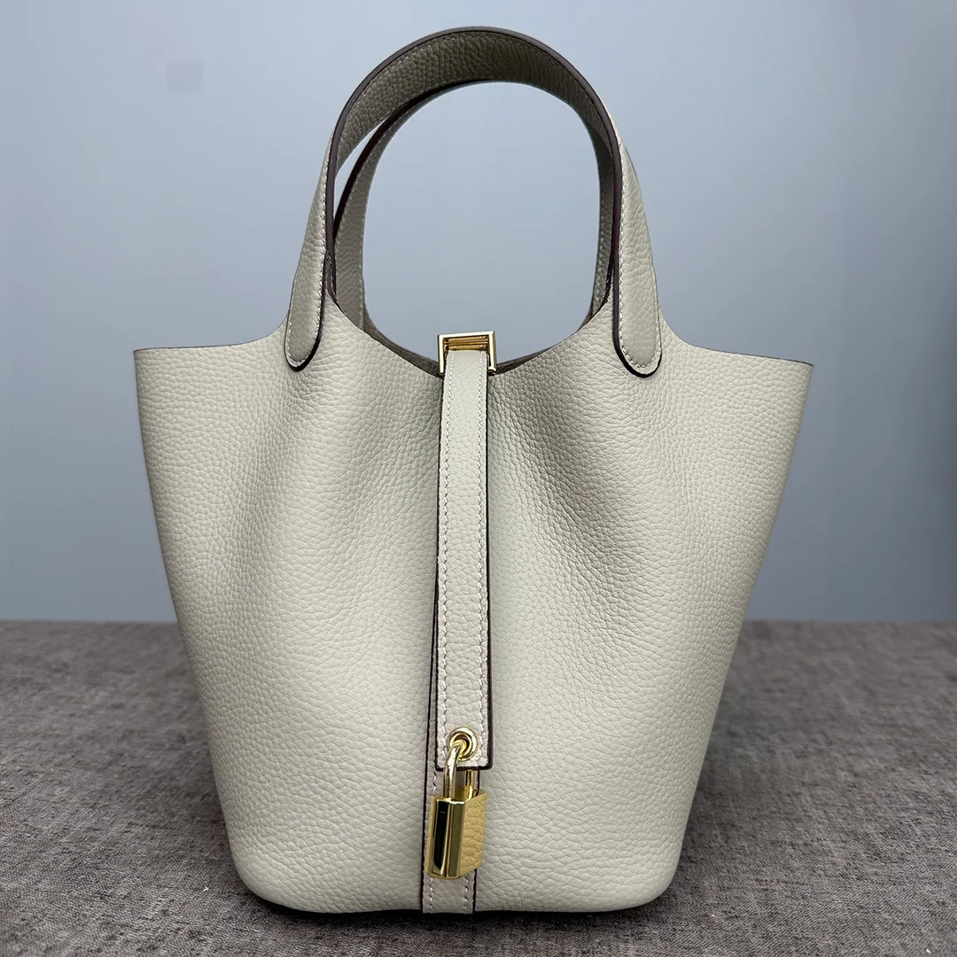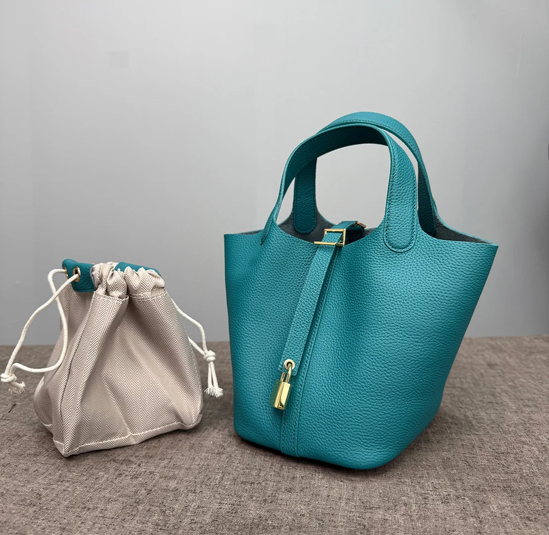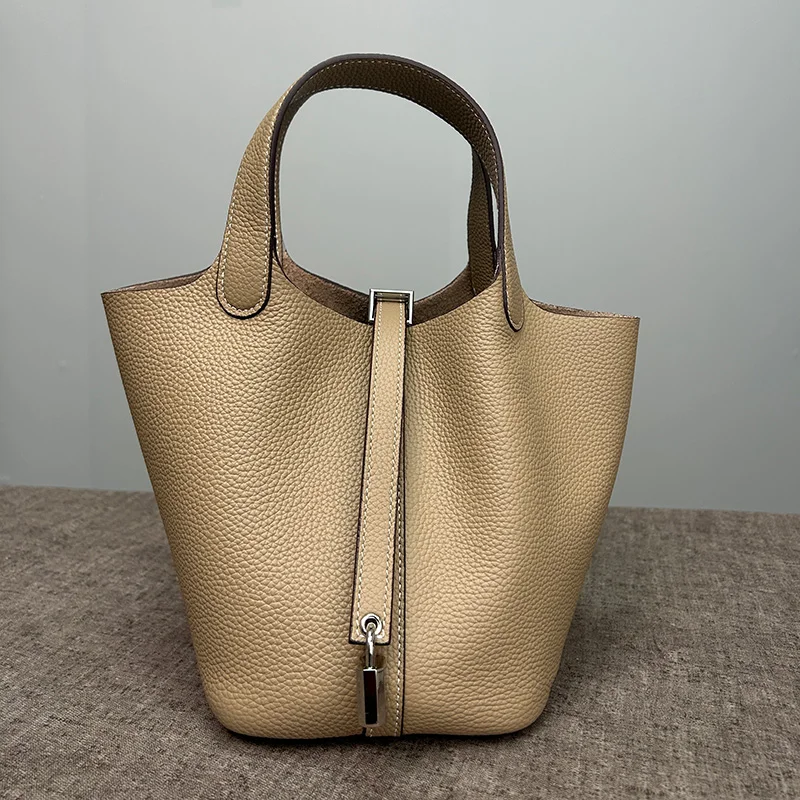 Featuring a chic bucket shape and elegant lock decoration, this bag is a fashionable accessory for any wardrobe.